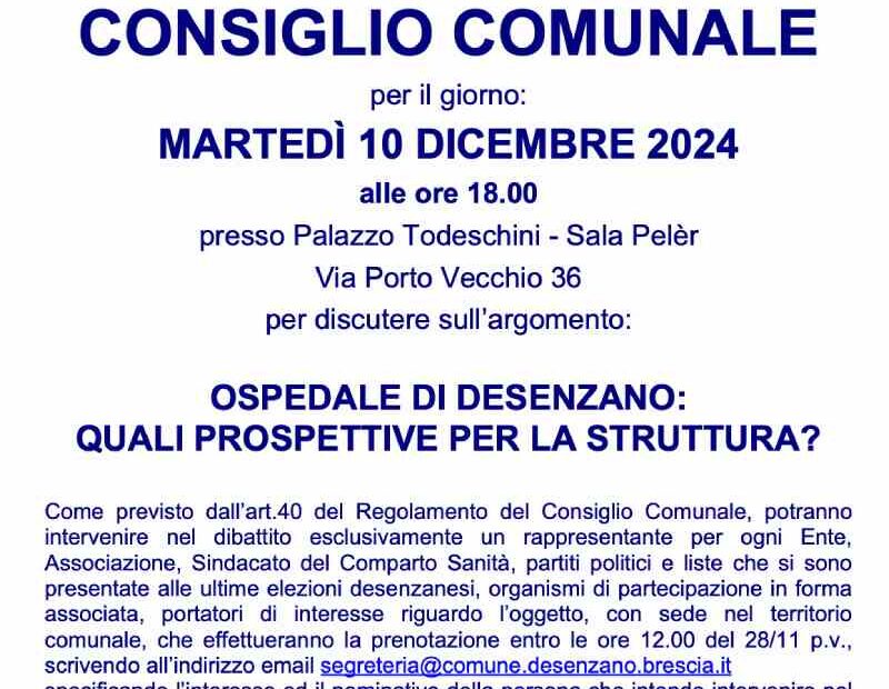 Il Consiglio comunale in modalità aperta tratterà del futuro dell’ospedale cittadino. Il Presidente del Consiglio comunale di Desenzano del Garda Paolo Abate ha convocato una seduta in modalità aperta, fissata in calendario per il prossimo 10… Consiglio Comunale Aperto sull’Ospedale