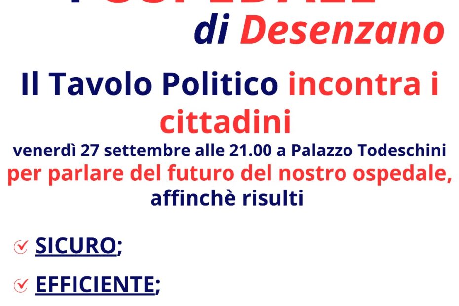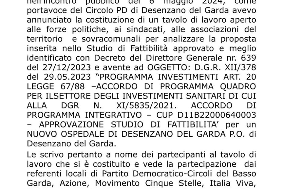 Il Tavolo Politico dell’Ospedale di Desenzano, formato dalle forze politiche del territorio (Partito Democratico, Azione, Italia Viva, Movimento Cinque Stelle, Partito Socialista, Alleanza Verdi e Sinistra, Possibile) ha presentato oggi ufficialmente al Sindaco di Desenzano… Il Tavolo presenta la sua Proposta