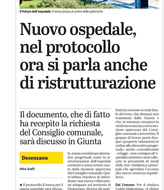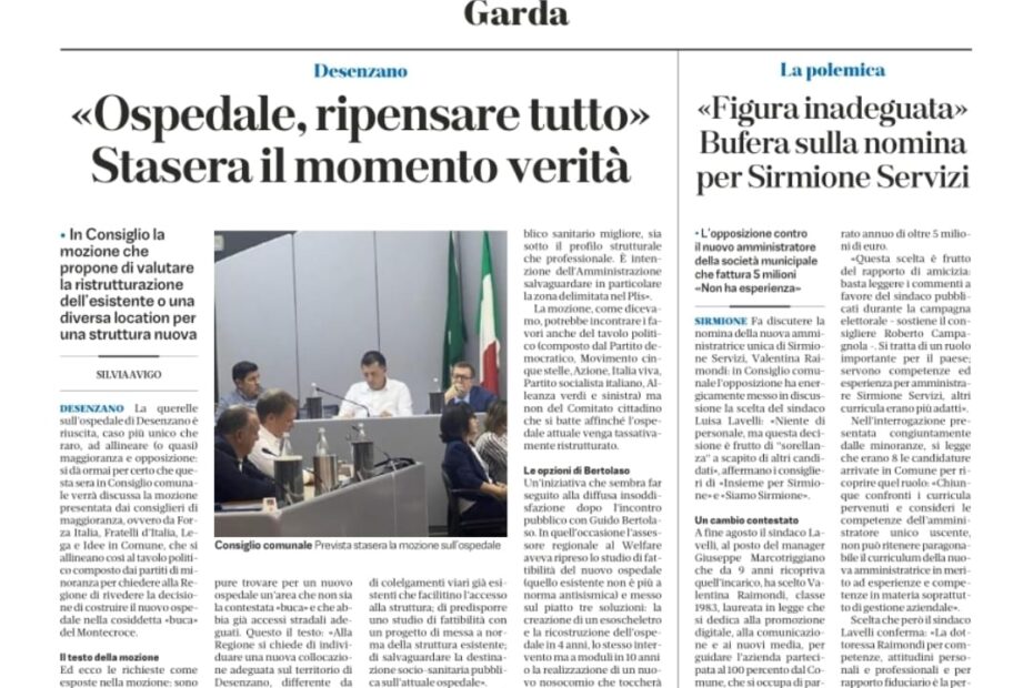 Articolo di Bresciaoggi sul Consiglio Comunale di stasera (27/09/2024), dove la maggioranza e la minoranza si uniscono per chiedere di “ripensare tutto” il progetto Ospedale a favore della Proposta Integrata.